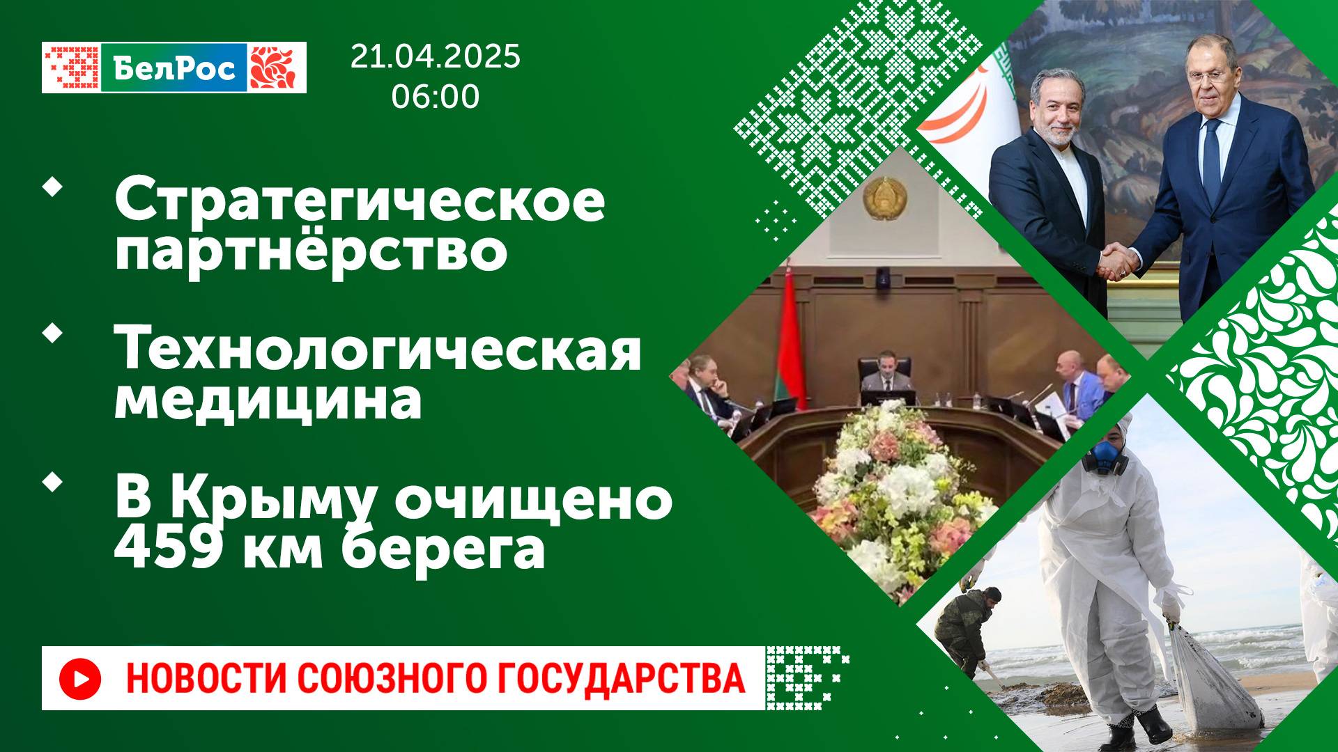 Закадровый текст озвучивает *ИИ Антон* Новости 21.04.2025 на 06:00 - Москва готова быть посредником в ядерной сделки Ирана и США. - В Беларуси появится централизованная информационная система здравоохранения. - Президентская библиотека Беларуси показала малоизвестные архивы и книги, связанные с ВОВ. - Школьник из Курской области собрал 160 флагов российских подразделений. - Цикл программ о героях СВО - по понедельникам в 20:45 на телеканале "БелРос". - Сотрудники МЧС собрали более 156 тысяч тонн загрязнённого песка и грунта с береговой линию. Смотрите главные новости Союзного государства на телеканале БелРос. Ссылки на наши соц. сети Сайт: http://belros.tv/ Telegram: https://t.me/belrostv Одноклассники: https://ok.ru/group/55657426976918 ВКонтакте: https://vk.com/belrostv TikTok: https://www.tiktok.com/@belros_tv?_t=... RuTube: https://rutube.ru/channel/23501830/ Яндекс. Дзен: https://zen.yandex.ru/belrostvv Наши подкасты на Яндекс. Музыке: https://music.yandex.ru/album/25615251 #главныеновости #новостисегодня #СоюзноеГосударство