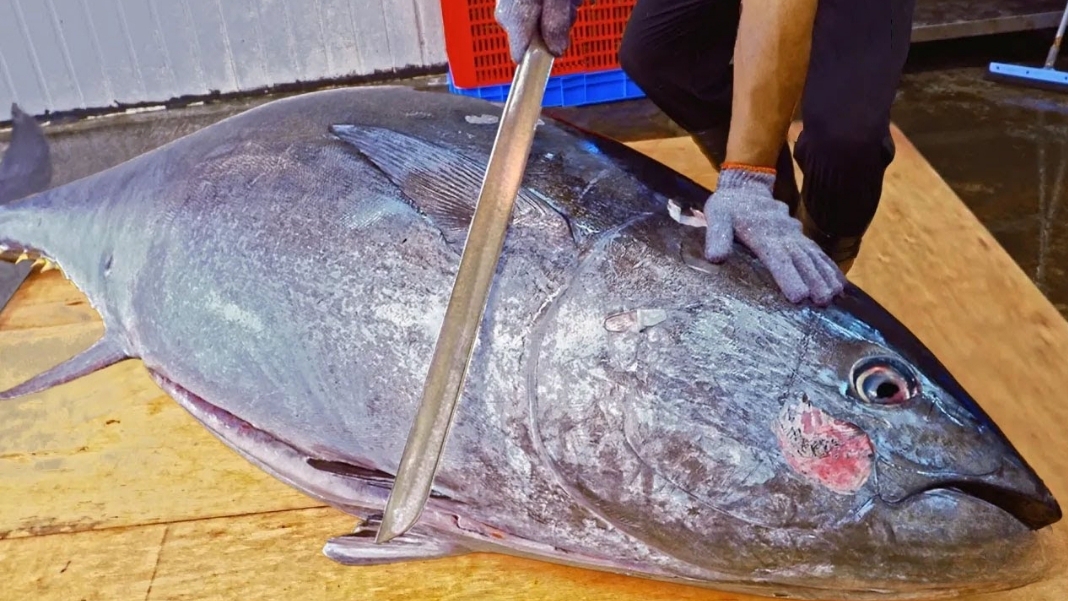 Тунец стоимостью 100,000$ Мастер разделывает самым острым ножом.