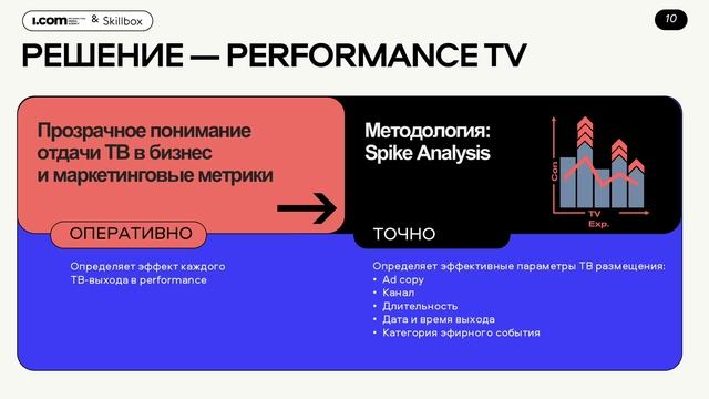 Руководитель группы аналитики i.com Владимир Кирко и директор по маркетингу Skillbox Павел Симонов рассказали о том, как сохранить прозрачный, измеримый результат в ТВ на примере performance-каналов, а также поделились интересными инсайтами по результатам спайк-анализа в разных категориях.