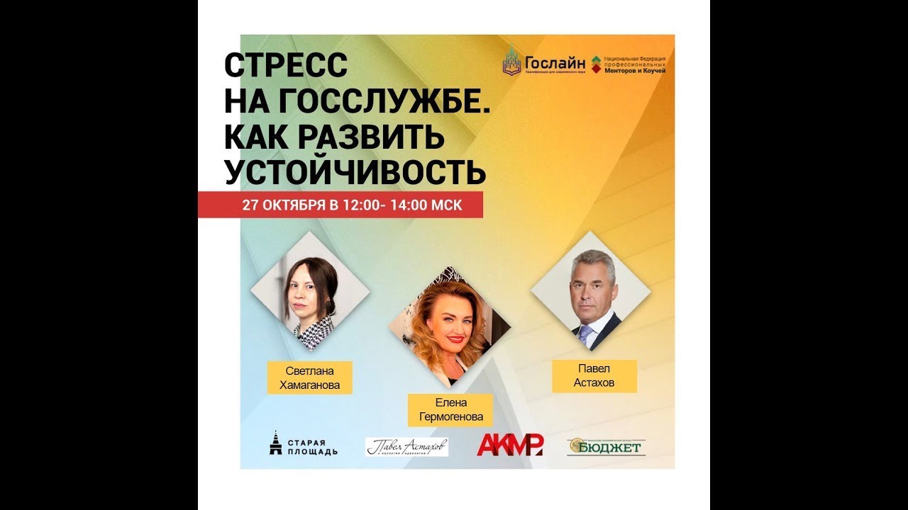 С момента начала политической карьеры различного рода кризисы и стрессы становятся неизбежны. Как развить стрессоустойчивость? И способы профилактики эмоционального выгорания. Вебинар для госслужащих и всех, кто взаимодействует с госсектором в своей профессиональной деятельности. Спикеры: Павел Астахов, Светлана Хамаганова, Елена Гермогенова. На вебинаре разберем вопросы: Как определить состояние эмоционального выгорания? Как развить стрессоустойчивость? Что помогает выходить из стресса? (https://coachmentor.ru/)