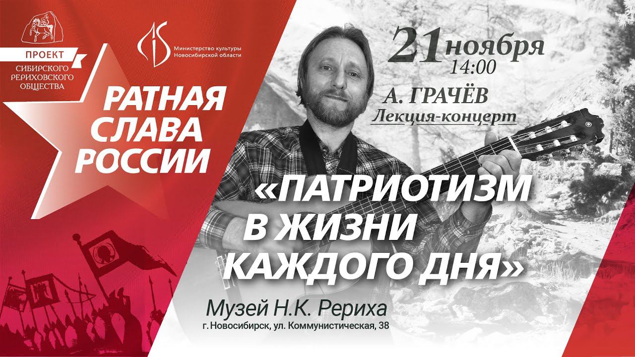 Запись трансляции https://youtu.be/zEIAu8OXE9s История полна самоотверженных подвигов и военного героизма. Но рождается ли он внезапно или воспитывается в мирное время? И что мы можем сделать для нашей Родины в мирные времена, что вообще означает понятие патриотизма, в чём он заключается, в чём может выражаться? О единстве мирного и ратного подвига во имя родины расскажет Алексей Грачёв, новосибирский автор-исполнитель. Концерт-лекция "Патриотизм в жизни каждого дня" пройдёт 21 ноября в 14-00 (МСК 10-00). Ждём вас в Музее Рериха (ул. Коммунистическая, 38) и в нашей группе трансляций. Встреча проходит в рамках проекта СибРО "Ратная слава России" при поддержке Министерства культуры Новосибирской области. #РатнаяСлаваРоссии #патриотизм #АлексейГрачёв #трансляциисибро #авторcкийконцерт _______________________________________________ Помочь проектам СибРО: https://sibro.ru/dari-dobro/ Благодарим наших помощников и приглашаем всех к сотрудничеству! -------------------------------------------- Канал Сибирского Рериховского Общества и Музея Николая Рериха в Новосибирске https://www.youtube.com/c/videosibro Канал «Трансляции СибРО» https://www.youtube.com/c/telesibro ВКонтакте «СибРО.Трансляции»: https://vk.com/telesibro Сайт СибРО: https://sibro.ru Сайт наследия Н.Д.Спириной: https://spirina.info Вконтакте: https://vk.com/roerichmuseumnsk Однокласники: https://ok.ru/roerichmuseum Telegram: https://t.me/RoerichN Дзен: https://dzen.ru/roerichmuseum Rutube: https://rutube.ru/channel/24606905/