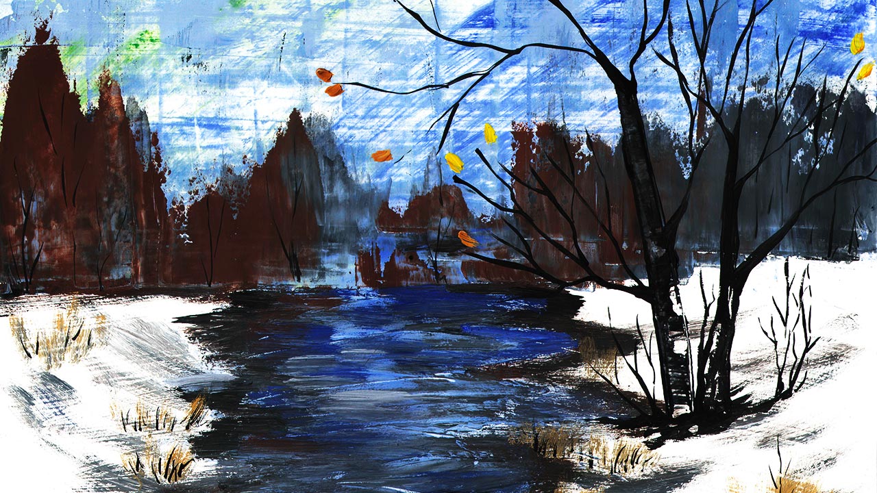 Как нарисовать позднюю осень. Рисуем пейзаж. Рисуем реку. Рисуем первый снег.