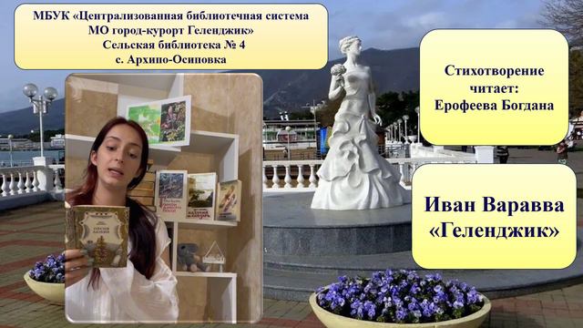 В рамках проведения Всероссийского онлайн-проекта «Россия читает Варавву», сельская библиотека №4 с. Архипо-Осиповка подготовила видеоролик и представила стихотворение Ивана Вараввы «Геленджик». В записи ролика приняла участие юная читательница Ерофеева Богдана учащаяся 11 класса МАОУ СОШ №17 им. Эдуарда Есаяна. #ЧитающийГеленджик, #БиблиотекиГеленджика