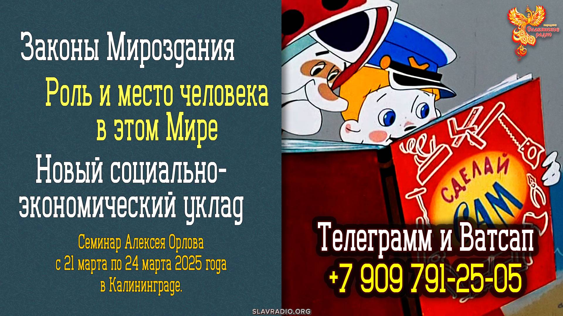 Рад сообщить, что с 21 по 24 марта 2025 года я буду в Калининграде проводить семинар, где главным образом будем разбирать вопросы мироустройства, роли человека в этом мире, ситуацию, в которой мы все оказались и что нам делать для улучшения жизни. Контакт организатора «Ватсап» и «Телеграм»: t.me/+79097912505 wa.me/79097912505 Нам предстоит научиться правдиво оценивать свои возможности, чтобы создать верный образ социально-экономического уклада общества, в котором мы хотели бы жить и развеиваться. Понять, какие действия нас могут привести к этому справедливому социально-экономическому укладу для счастливой жизни своих Родов и потомков! Вместе мы станем искать решения по совместному построению честного гармоничного будущего. Всех, кто задумывается о своей судьбе, судьбе своей семьи, своего Рода и Отечества и кто просто хочет познакомиться с тем, по каким принципам жили наши великомудрые предки – буду рад видеть на наших встречах. Основной семинар будет проходить два дня 22 и 23 марта с 10 до 18 часов с небольшими перерывами. До семинара, 21 марта состоится встреча-знакомство, а после семинара 24 марта в 17:00 мы соберемся на мозговой штурм для формирования группы из тех, кто готов к объединению и действиям. Жду инициативных, честных людей! Людей дела! Встретимся на семинаре и мозговом штурме в Калининграде 21, 22, 23 и 24 марта 2025 года и вместе сделаем Мир лучше. Контакт организатора «Ватсап» и «Телеграм»: t.me/+79097912505 wa.me/79097912505 Быть добру! #законымироздания #семинар #алексейорлов #калининград #народнаяэкономика ---------------------------------------- ПОДДЕРЖАТЬ РАДИО https://slavradio.org/page/charity/ ---------------------------------------- «Народное Славянское радио» – это просветительский проект, созданный для изучения родной культуры. У нас нет инвесторов и рекламы. Мы существуем исключительно на добровольном вкладе слушателей. Любая сумма - для нас помощь! ---------------------------------------- МЫ В ИНТЕРНЕТЕ: http://slavradio.org plvideo.ru/@slavradio https://vk.com/slavradio_org https://ok.ru/slavradio https://t.me/SlavRadio_org https://zen.yandex.ru/slavradio_org https://bastyon.com/slavradio?ref=PNoR5LNLAZP3VGiNcK2wn4xxAFT6yQAMqj https://rutube.ru/channel/23938023/ ---------------------------------------- Сделаем вместе Мир лучше! ---------------------------------------- * Внимание! Мы будем благодарны за распространение всех видео нашего канала. Мы не приветствуем изменение содержания роликов с удалением знаков нашего канала и искусственного ремонтажа изменяющего смысл видео.