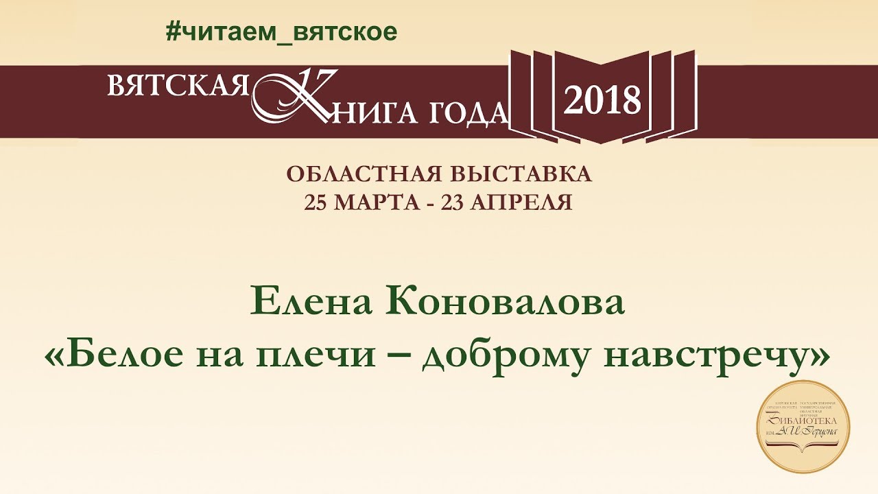 Флешмоб «Читаем вятское» библиотеки им. А. И. Герцена (г. Киров). Областная выставка «Вятская книга года – 2018» В новой книге поэтессы Елены Коноваловой откроется читателям мир таинственный и обыденный, сотканный из ярких преданий и повседневных забот. Автор жила в этом мире, разделяя все печали и радости с его обитателями, и впитала в душу свою всё родное и близкое, прошлое и настоящее, сокровенное и сбережённое, чтобы поведать теперь вам, доверить… …И оживут сказания и сказки, услышанные в детстве, войдут в обиход афористичные присловия, пословицы и поговорки, и не отпустят уже мамины слова, которые говорила она, одевая в чистое после бани ребят: «Белое на плечи – доброму навстречу». #читаем_вятское #вятскаякнигагода #Герценка