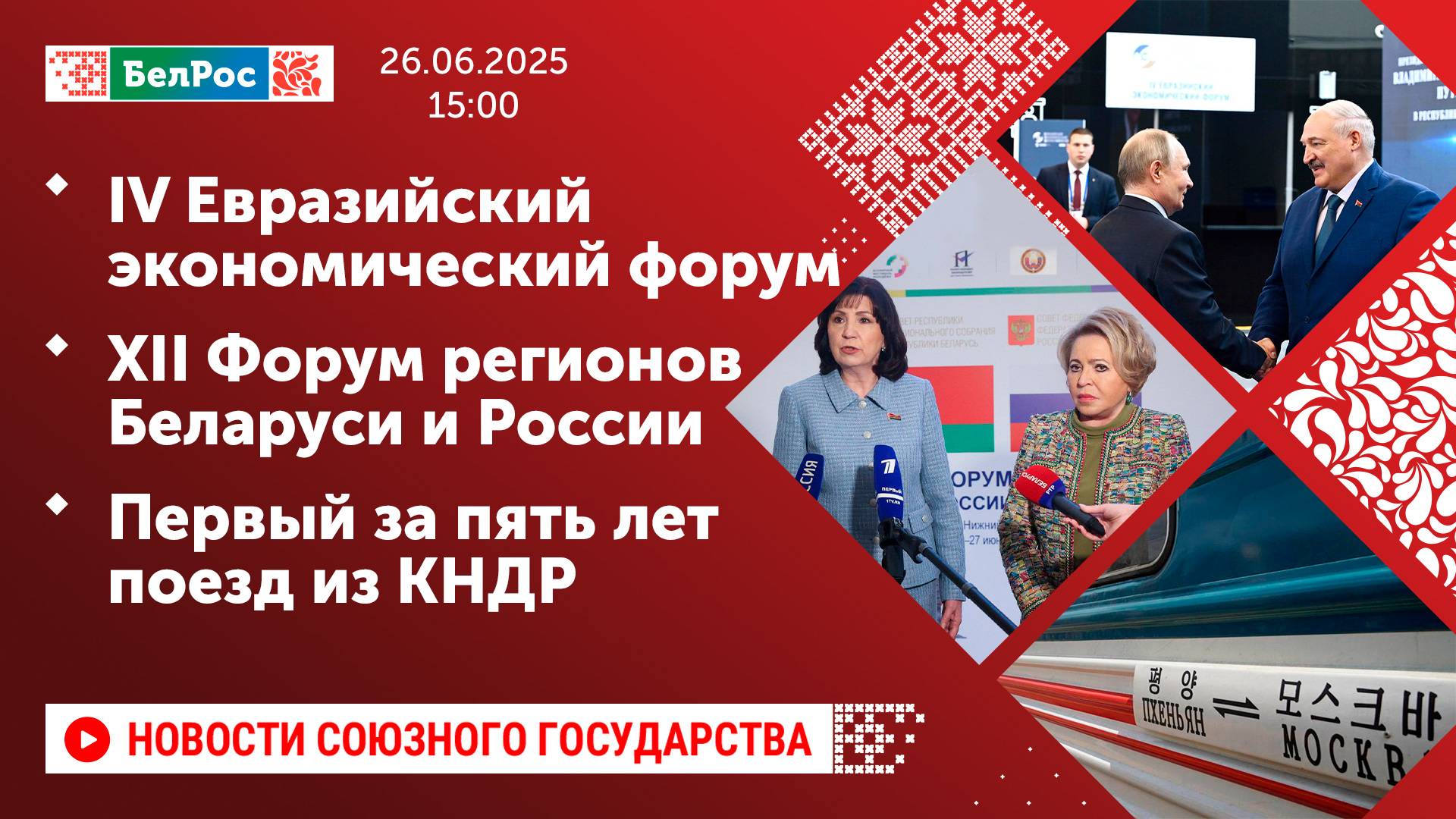 Закадровый текст озвучивает *ИИ Антон* Новости 26.06.2025 на 15:00 - В Минске стартовал IV Евразийский экономический форум. - В Нижнем Новгороде проходит XII Форум регионов Беларуси и России. - Первый за пять лет пассажирский поезд из КНДР прибыл в Москву. Смотрите главные новости Союзного государства на телеканале БелРос. Ссылки на наши соц. сети Сайт: http://belros.tv/ Telegram: https://t.me/belrostv Одноклассники: https://ok.ru/group/55657426976918 ВКонтакте: https://vk.com/belrostv TikTok: https://www.tiktok.com/@belros_tv?_t=... RuTube: https://rutube.ru/channel/23501830/ Яндекс. Дзен: https://zen.yandex.ru/belrostvv Наши подкасты на Яндекс. Музыке: https://music.yandex.ru/album/25615251 #главныеновости #новостисегодня #СоюзноеГосударство