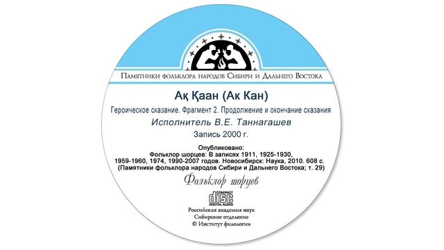 Ақ Қаан (Ак Кан). Героическое сказание, текст 1. Фрагмент 1. Начало сказания (Вступление, тирады 1—11, по строку 391 включительно). Исполнитель В.Е. Таннагашев. Запись 2000 г. Опубликовано: Фольклор шорцев: В записях 1911, 1925-1930, 1959-1960, 1974, 1990-2007 годов. Новосибирск: Наука, 2010. 608 с. (Памятники фольклора народов Сибири и Дальнего Востока; т. 29).