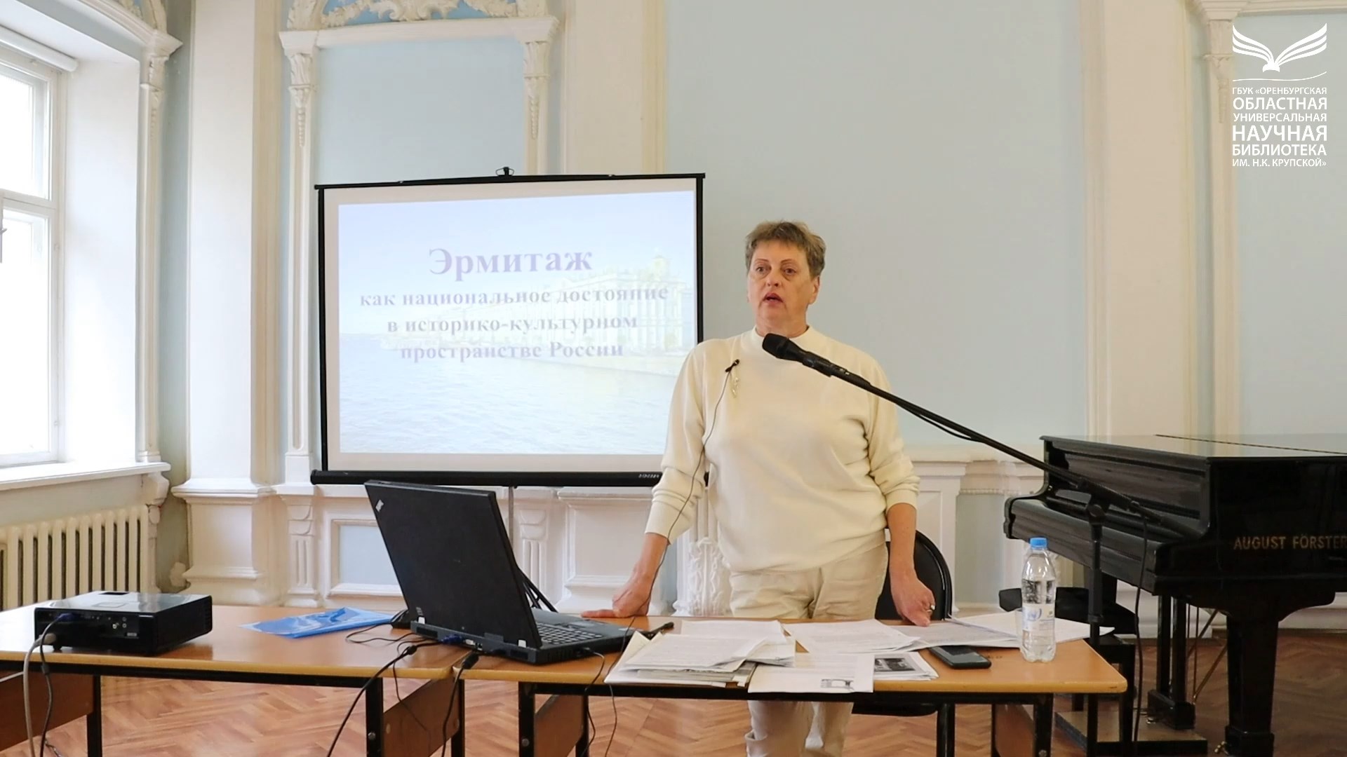 15 сентября 2022 года стартовала региональная просветительская акция «Дни Эрмитажа в Оренбурге». В этот же день в главной библиотеке области состоялась публичная лекция «Эрмитаж как национальное достояние в историко-культурном пространстве России». Лекцию студентам образовательных учреждений города прочла кандидат исторических наук, доцент Оренбургского государственного института искусств им. Л. и М. Ростроповичей Ольга Смирнова. Лектор познакомила слушателей с историей зданий музея, главным из которых является Зимний дворец, построенный по проекту архитектора Бартоломео Растрелли. Свое выступление Ольга Алексеевна дополнила электронной презентацией. Десятки слайдов подтверждали мировую славу Государственного Эрмитажа - этого величественного архитектурного ансамбля в самом сердце Санкт-Петербурга, где собраны выдающиеся памятники мировой культуры, масштабные коллекции живописи. Сегодня Эрмитаж - это дворец-музей, насчитывающий около трёх миллионов произведений искусства от каменного века до наших дней. Это поистине сокровищница культурных ценностей и наше национальное достояние. - Очень ценно, что акция «Дни Эрмитажа в Оренбурге», в частности благодаря лекциям и электронным ресурсам библиотеки имени Крупской, даёт нам возможность «посетить» главный музей страны и один из величайших музеев мира не только не покидая Оренбуржье, но даже не выходя из дома! - отметила Ольга Смирнова.