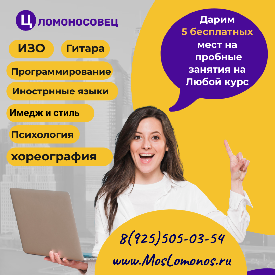 Центр «Ломоносовец» У нас есть курсы всех направлений для детей и взрослых! Все наши преподаватели имеют педагогическое образование. Это выпускники ведущих ВУЗов страны. Именно они поведут вас в мир творчества, научат работать с разными материалами и техниках в разных направлениях. Кроме того, каждый наш, даже самый молодой преподаватель, - это опытный педагог с многолетним опытом работы. Преподаватели школы с легкостью находят общий язык с учениками разного возраста и уровня подготовки. И, конечно же, все они прекрасные специалисты: они участвуют в социальных и коммерческих проектах, побеждают и постоянно развиваются, как специалисты. Мы сделали цены максимально доступными, чтобы каждый из вас мог позволить себе профессиональное обучение. У нас индивидуальный подход к каждому участнику! Скидки, Акции и просто интересные мероприятия. Более детальную информацию вы можете получить на сайте, а так же в нашем центре. Центр Профессионального Развития "Ломоносовец" Наш сайт: www.MosLomonos.ru По адресу: Москва, Керамический проезд дом 45, корпус 1. Или по Телефону: +7 (495) 505-03-54 +7 (925) 505-03-54 #онлайнобучение #обучениемосква #английскийязык #ИЗО#английскийонлайн #учимязыкионлайн #скетчинг #психология #хореография #курсы #курсыдлявзрослых #урокигитары #английскийязыкснуля #ИТ #гдеучится #програмирование #имеджистиль #длядетей #интересно #урокирисования #риторика #ораторскоемастерство #ланлшафтныйдизайн #танцы #компьютер #ломоносовец #дегунино #красиво #полезнознать #хочувсезнать