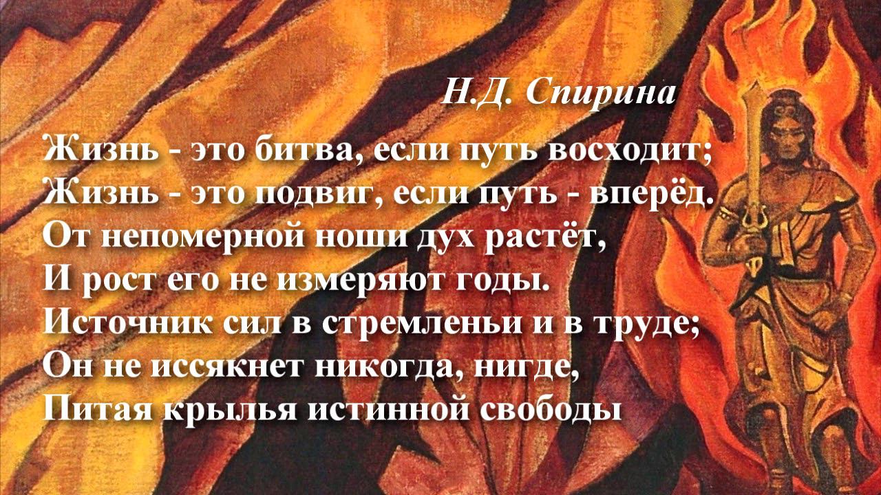 ЖИЗНЬ — ЭТО БИТВА, ЕСЛИ ПУТЬ ВОСХОДИТ... Наталия Спирина. Читает автор. Жизнь — это битва, если путь восходит; Жизнь — это подвиг, если путь — вперёд. От непомерной ноши дух растёт, И рост его не измеряют годы. Источник сил в стремленье и в труде; Он не иссякнет никогда, нигде, Питая крылья истинной свободы. • Рериховская поэзия на сайте СибРО: http://sibro.ru/poetry/ #НаталияСпирина, #поэзияновойэпохи, #ПоэзияСпириной -------------------------------------------- О Наталии Дмитриевне Спириной: * Сайт, посвященный Н.Д. Спириной: https://spirina.info * Раздел на сайте СибРО: http://sibro.ru/teacher/spirina/ * Читать стихи: https://sibro.ru/poetry/ * Плейлист "Наталия Спирина. Стихи": https://www.youtube.com/playlist?list=PLRDwJtqWLAx6FDWLWUSyVeqmBAs0Cfx7c * Видеофильмы о Н.Д. Спириной: https://www.youtube.com/playlist?list=PLRDwJtqWLAx7zdjQRW1u5QSUW3T6SJ4rj * Вконтакте: https://vk.com/natalia.spirina * Telegram: https://t.me/SpirinaN • Рериховская поэзия: https://www.youtube.com/playlist?list=PLRDwJtqWLAx6Q4cJ_smGoz7zmaKXZee-N • Рериховская поэзия на сайте СибРО: http://sibro.ru/poetry/ -------------------------------------------- Помочь проектам СибРО: https://sibro.ru/dari-dobro/ Благодарим всех наших помощников и приглашаем к сотрудничеству! -------------------------------------------- /// Ссылки на ресурсы СибРО: Канал Сибирского Рериховского Общества и Музея Николая Рериха в Новосибирске https://www.youtube.com/c/videosibro Канал «Трансляции СибРО» https://www.youtube.com/c/telesibro ВКонтакте: «СибРО. Трансляции»: https://vk.com/telesibro Сайт СибРО: https://sibro.ru Сайт наследия Н.Д.Спириной: https://spirina.info Вконтакте: https://vk.com/roerichmuseumnsk Однокласники: https://ok.ru/roerichmuseum Telegram: https://t.me/RoerichN Дзен: https://dzen.ru/roerichmuseum Rutube: https://rutube.ru/channel/24606905/ Интернет-магазин "Искры Света": https://knigisibro.ru или на Ozon: https://www.ozon.ru/publisher/rossaziya-5101720/ Книги издательства СибРО "РОССАЗИЯ": https://rossasia.sibro.ru/knigi/