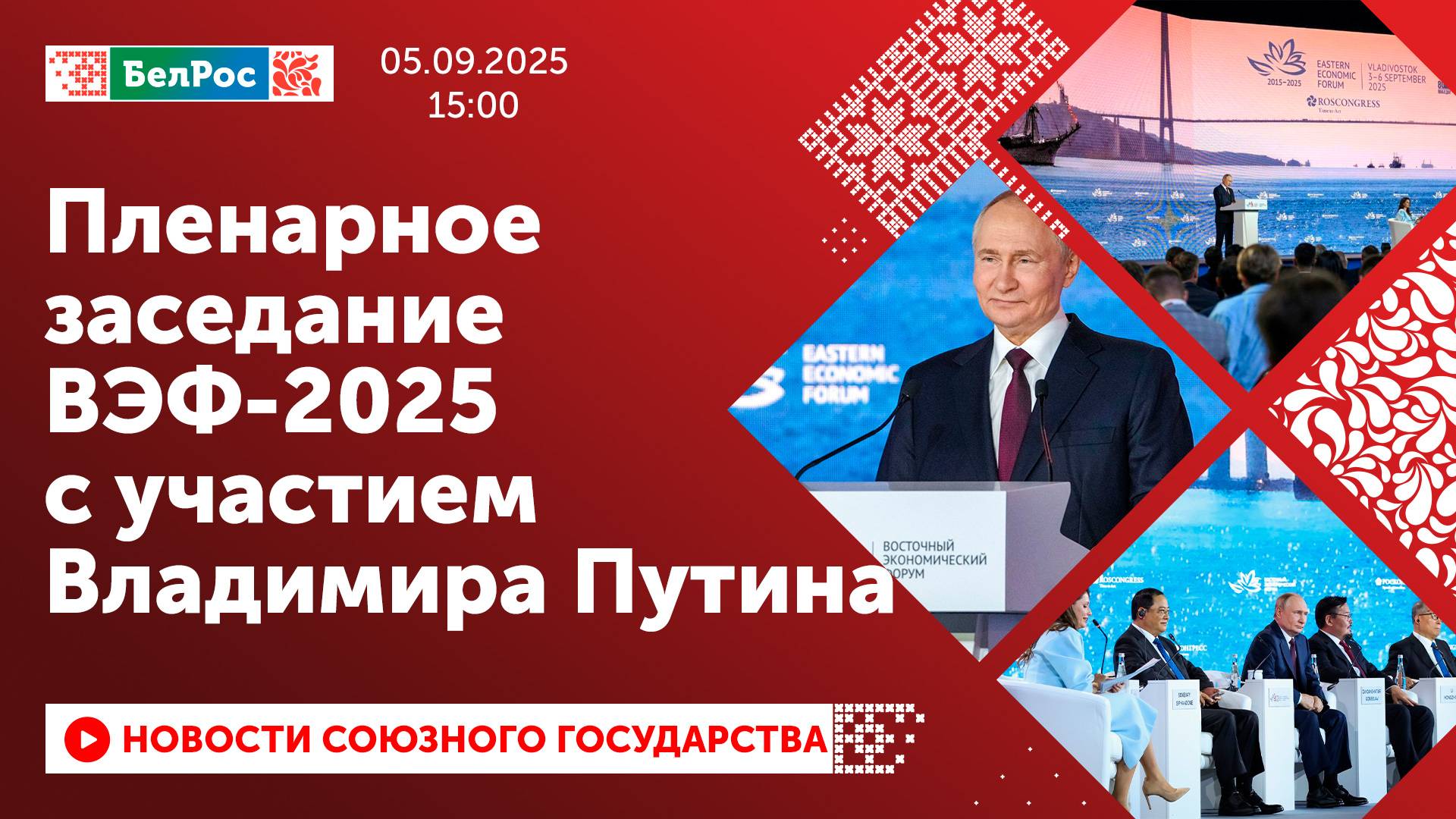Закадровый текст озвучивает *ИИ Антон* Новости 05.09.2025 на 15:00 - Владимир Путин: развитие Сибири и Дальнего Востока - наш национальный приоритет. - Президент России: российские регионы укрепляют сотрудничество с азиатскими партнёрами. - Участники дискуссии обсудили активное внедрение технологий искусственного интеллекта. - Путин: Россия открыта к сотрудничеству со всеми странами, в том числе с США. - Российский лидер: Москва - лучшее место для встречи с главой киевской администрации. - Трёхчасовой диалог завершился ответом Владимира Путина на вопрос, каким будет мир. Смотрите главные новости Союзного государства на телеканале БелРос. Ссылки на наши соц. сети Сайт: http://belros.tv/ Telegram: https://t.me/belrostv Одноклассники: https://ok.ru/group/55657426976918 ВКонтакте: https://vk.com/belrostv TikTok: https://www.tiktok.com/@belros_tv?_t=... RuTube: https://rutube.ru/channel/23501830/ Яндекс. Дзен: https://zen.yandex.ru/belrostvv Наши подкасты на Яндекс. Музыке: https://music.yandex.ru/album/25615251 #главныеновости #новостисегодня #СоюзноеГосударство