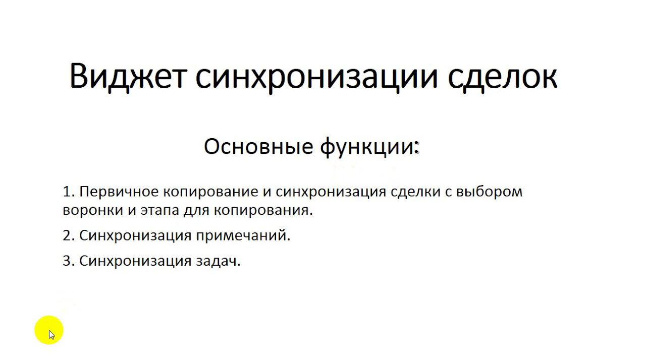 Описание разработанного нами виджета по копированию и синхронизации сделок в AmoCRM. Основные функции виджета: - выбор воронки для копируемой сделки - копирование всех полей сделки и примечаний (а также звонков и смс) - двусторонняя синхронизация изменений (при добавлении примечания оно добавится в связанную сделку, также синхронизируются задачи и смена статусов) - поддерживается более двух связанных сделок (может быть 3 и более связанных сделок) - синхронизация задач (если на себя создал задачу в связанной сделке комментарий, если на ответственного в связанной сделке то у него тоже создатся задача, а я получу уведомление с комментарием о её закрытии) Для заказа данного виджета можете оставлять заявку на сайте: http://cifra-online.ru