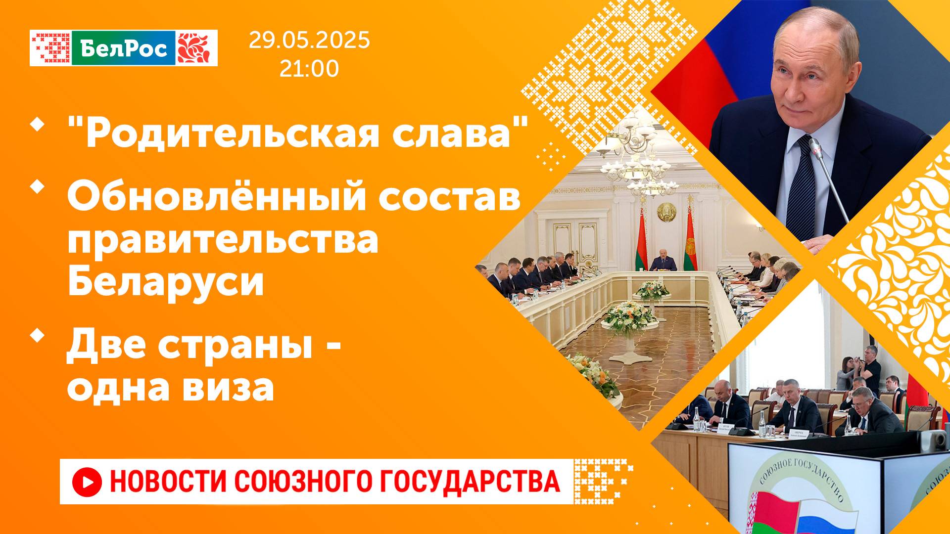 Закадровый текст озвучивает *ИИ Антон* Новости 29.05.2025 на 21:00 - Владимир Путин по видеосвязи провёл встречу с многодетными семьями. - Александр Лукашенко провёл первое совещание с обновлённым составом правительства. - В Беларусь прибыла партия российских самолётов Су-30СМ2. - Около 60 тыс. туристов воспользовались соглашением России и Беларуси о признании виз. - Участник программы "Время героев" погиб в результате взрыва самодельной бомбы. Смотрите главные новости Союзного государства на телеканале БелРос. Ссылки на наши соц. сети Сайт: http://belros.tv/ Telegram: https://t.me/belrostv Одноклассники: https://ok.ru/group/55657426976918 ВКонтакте: https://vk.com/belrostv TikTok: https://www.tiktok.com/@belros_tv?_t=... RuTube: https://rutube.ru/channel/23501830/ Яндекс. Дзен: https://zen.yandex.ru/belrostvv Наши подкасты на Яндекс. Музыке: https://music.yandex.ru/album/25615251 #главныеновости #новостисегодня #СоюзноеГосударство