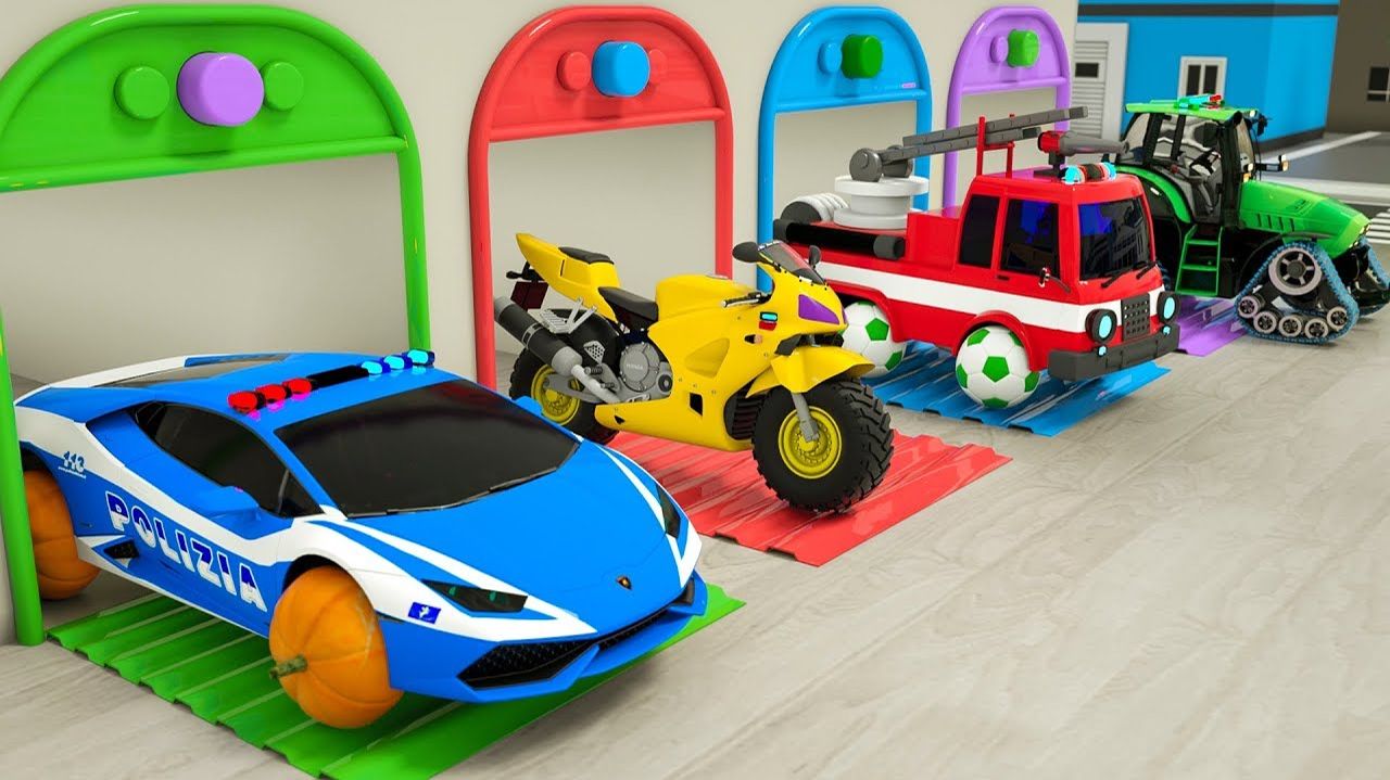 Пожарные машины, полицейские автомобили, тракторы и мотоциклы выезжают из гаража на новых колёсах.