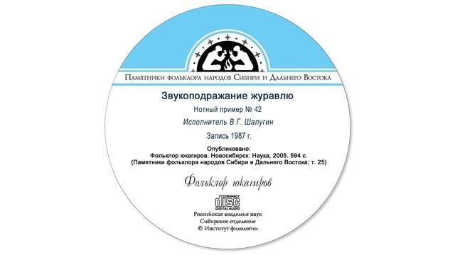Звукоподражание журавлю. Нотный пример № 42. Исполнитель В.Г. Шалугин, пос. Зырянка Верхнеколымского района Якутии. Запись 1987 г. Опубликовано: Фольклор юкагиров. Новосибирск: Наука, 2005. 594 с. (Памятники фольклора народов Сибири и Дальнего Востока; т. 25).