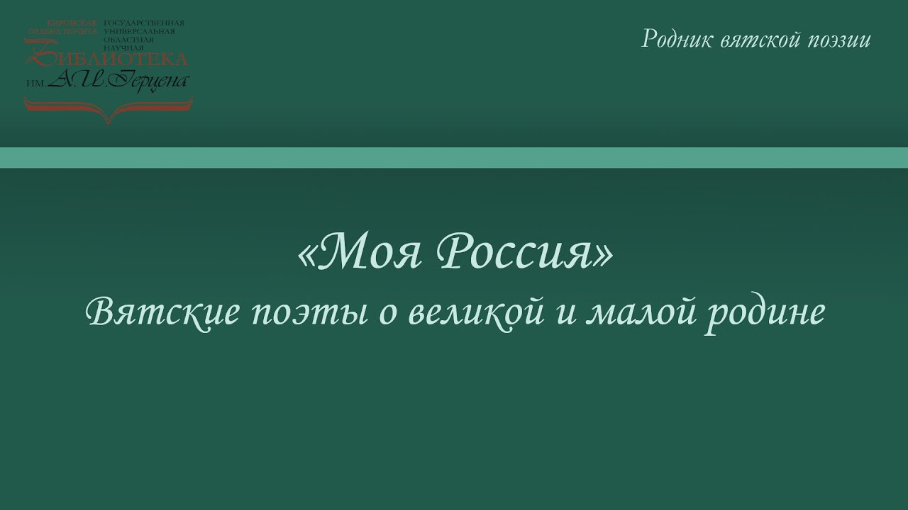 Фрагменты видеозаписей вечеров «Моя Россия» (2015) и «Это Родины добрая сила» (2019) из цикла «Родник вятской поэзии». «У каждого – своя Россия… Вблизи она или вдали», – сказал в стихотворении «Моя Россия», написанном к одноимённому вечеру, поэт Андрей Жигалин (1969-2018). Вятские поэты и музыканты вписали немало прекрасных страниц о России и Вятском крае в сокровищницу русской литературы. В поэтическую композицию, посвящённую Дню России и Дню города, вошли стихи и песни о любви к большой и малой родине лауреатов всероссийских конкурсов Ильи Городничева (вокал, фортепиано), Андрея Жигалина, Николая Пересторонина, Андрея Антонова, Александра Докучаева, Елены Коноваловой, Натальи Кузницыной, Надежды Мохиной, Татьяны Арбузовой, Ольги Халявиной, Оксаны Чупраковой и Константина Юдичева (вокал, гитара).