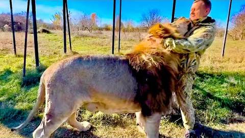 Олег Зубков пришел к своим львам и вожак всех львов Чук ЛАСТИТСЯ к нему как БОЛЬШОЙ КОТ