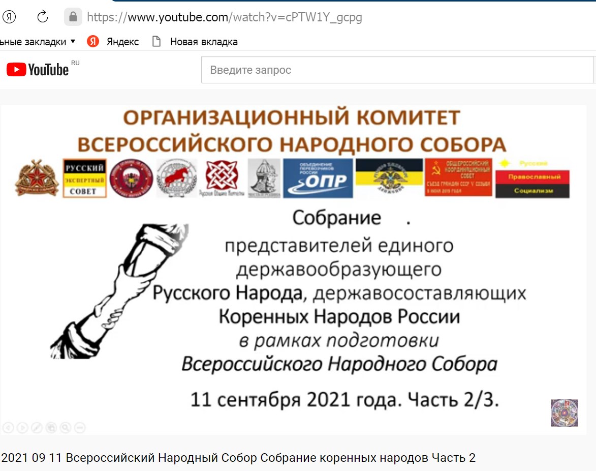 2021 09 11 #Всероссийский Народный #Собор #Собрание коренных народов Часть 1 https://youtu.be/EM4rD9xwDbQ 23 сент. 2021 г. Главная » 2021 » Сентябрь » 12 » Оргкомитет Всероссийского Народного собора (ВНС) начал свою работу. 13:32. Оргкомитет Всероссийского Народного собора (ВНС) начал свою работу. 11 сентября с.г. в штабе Общероссийского Офицерского Собрания состоялось первое Собрание представителей Русского, других коренных народов (носители общей цивилизационности) России. На нем были заслушаны доклады по теме ВНС и оглашены проекты итоговых документов для обсуждения и принятия ВНС.(будут направлены выдвинутым делегатам для обсуждения в выдвинувших их сообществах). Выборы в ГД состоялись с прогнозируемым результ.... 2021 09 11 Всероссийский Народный Собор Собрание коренных народов Часть 2 Ценностные ориентиры- Румянцева Нина Леонидовна 23 сент. 2021 г. https://youtu.be/cPTW1Y_gcpg