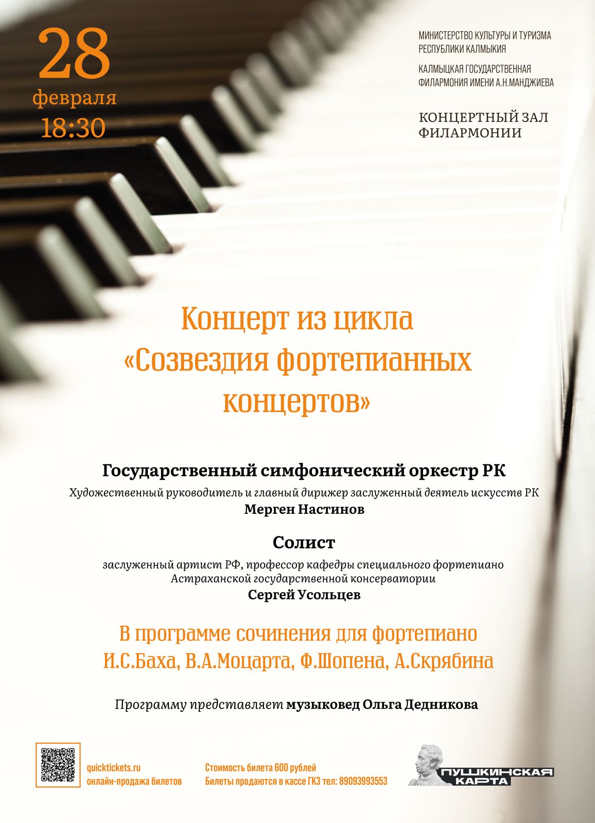 Музыкальный вечер из цикла «Созвездия фортепианных концертов». Солист - заслуженный артист РФ, профессор кафедры специального фортепиано Астраханской государственной консерватории Сергей Усольцев. В концерте принимает участие Государственный симфонический оркестр РК (Художественный руководитель и главный дирижер заслуженный деятель искусств РК Мерген Настинов). В программе: сочинения для фортепиано И.С.Баха, В.А.Моцарта, Ф.Шопена, А.Скрябина. Программу представляет музыковед Ольга Дедникова