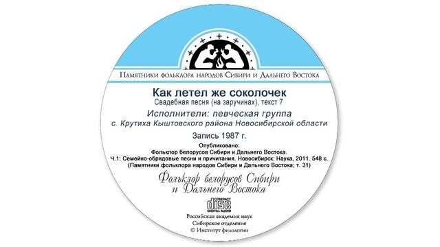 Свадебная песня (на заручинах), текст 7. Исполнители: певческая группа с. Крутиха Кыштовского района Новосибирской области. Запись 1987 г. Опубликовано: Фольклор белорусов Сибири и Дальнего Востока. Ч. 1: Семейно-обрядовые песни и причитания. Новосибирск: Наука, 2011. 548 с. (Памятники фольклора народов Сибири и Дальнего Востока; Т. 31)