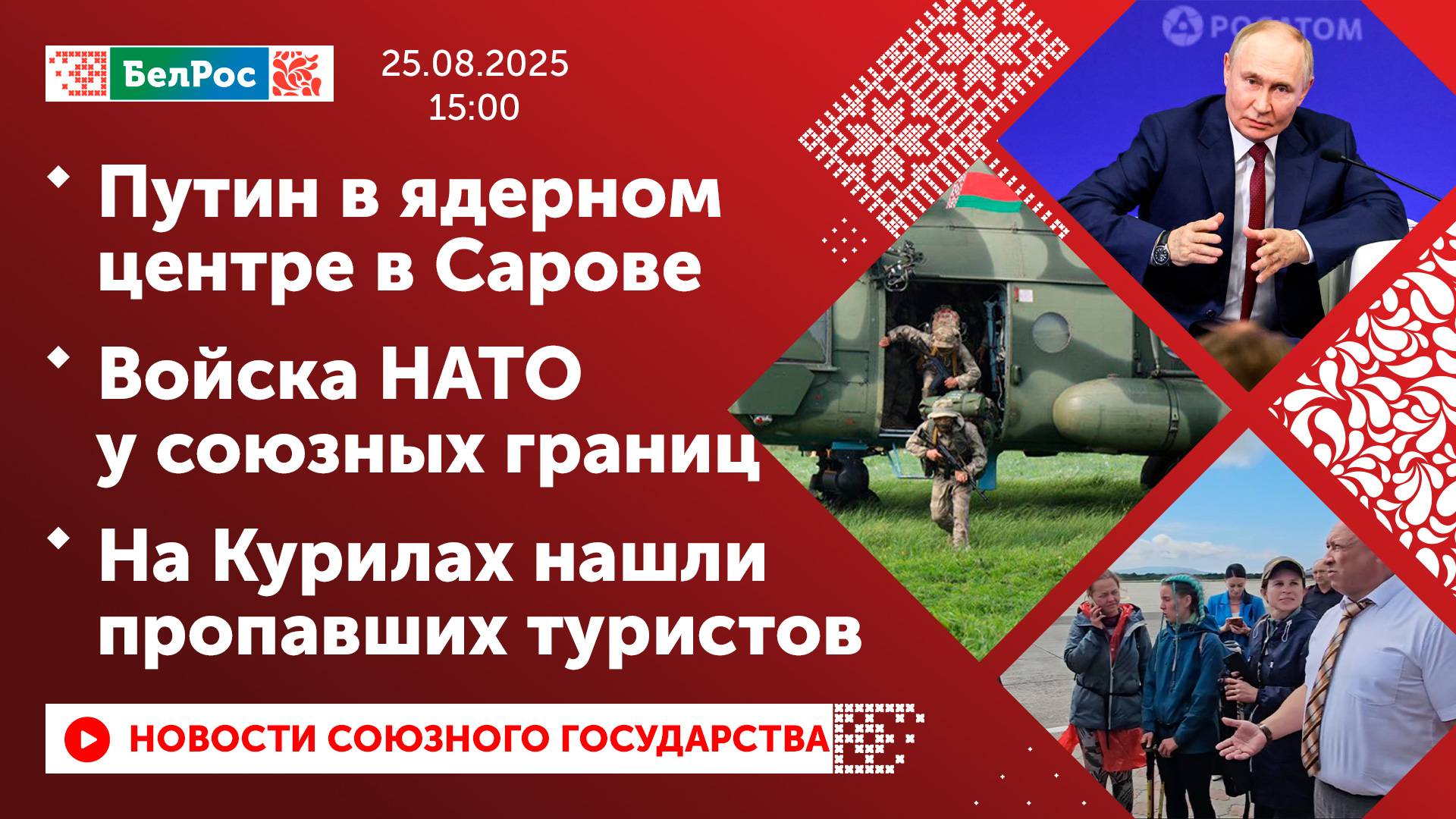 Закадровый текст озвучивает *ИИ Антон* Новости 25.08.2025 на 15:00 - Владимир Путин посетил ядерный центр в Сарове и пообщался с учёными-атомщиками. - 8 жителей Курской области возвращены на Родину с подконтрольной Киеву территории. - 146 российских военнослужащих вернулись домой, столько же боевиков ВСУ передано Киеву. - В Литве начались военные учения в непосредственной близости с Гродненской области. - Спасатели обнаружили группу из 10 туристов, пропавших накануне на Курильских островах. Смотрите главные новости Союзного государства на телеканале БелРос. Ссылки на наши соц. сети Сайт: http://belros.tv/ Telegram: https://t.me/belrostv Одноклассники: https://ok.ru/group/55657426976918 ВКонтакте: https://vk.com/belrostv TikTok: https://www.tiktok.com/@belros_tv?_t=... RuTube: https://rutube.ru/channel/23501830/ Яндекс. Дзен: https://zen.yandex.ru/belrostvv Наши подкасты на Яндекс. Музыке: https://music.yandex.ru/album/25615251 #главныеновости #новостисегодня #СоюзноеГосударство