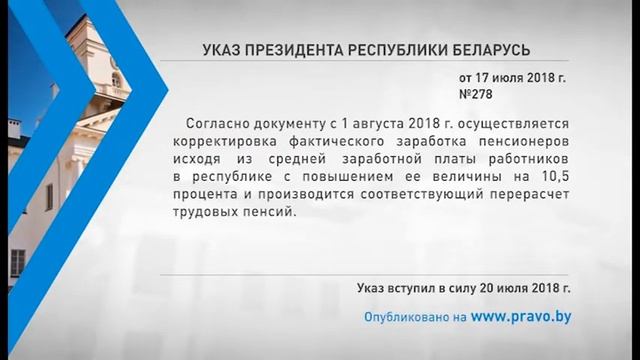 Согласно документу с 1 августа 2018 года осуществляется корректировка фактического заработка пенсионеров исходя из средней заработной платы работников в республике с повышением ее величины на 10,5 процента и производится соответствующий перерасчет трудовых пенсий. Финансирование расходов по повышению пенсий осуществляется за счет средств государственного внебюджетного фонда социальной защиты населения Республики Беларусь.