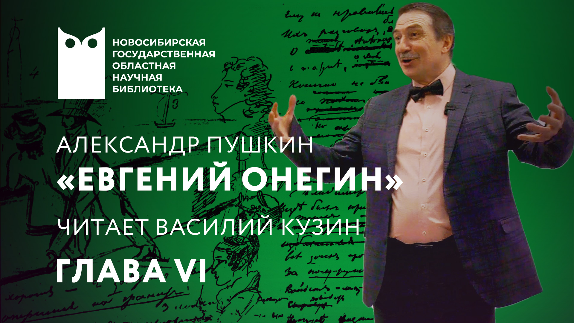 Профессор Новосибирского государственного театрального института (НГТИ) Василий Иванович Кузин читает роман в стихах Александра Сергеевича Пушкина «Евгений Онегин». Цикл литературных встреч приурочен к 225-летию Пушкина и проходит в рамках сотрудничества Новосибирской государственной областной научной библиотеки с театральным институтом. «Евгений Онегин» (1823—1830 гг.) — значительное произведение русской словесности, которое настолько объёмно и многогранно, что в разном возрасте и в разное время в нём можно найти новые смыслы, сделать удивительные открытия. Василий Кузин — один из самых активных и ярких пропагандистов художественного слова. У него есть одна удивительная особенность: произносит ли он речь для большой незнакомой аудитории, или для знакомой, студенческой, небольшой камерной, — Василий Иванович обращается к слушателям как к старым добрым друзьям. Проект будет интересен школьникам, студентам, преподавателям, всем любителям русской литературы и художественного слова. 19 апреля 2024 г. #ngonb #нгонб
