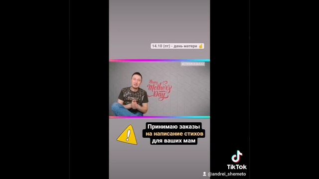 ЧТО ПОДАРИТЬ НА ДЕНЬ МАТЕРИ? То, что наверняка тронет её до глубины души . Пора сказать маме все главные слова. И я помогу в этом, упаковав в трогательные строки все ваши мысли, чувства и пожелания ! Оставить заказ на написание стихов вы можете связавшись со мной любым удобным способом. Буду рад помочь . С уважением, Андрей Шемето https://instagram.com/andrei_shemeto