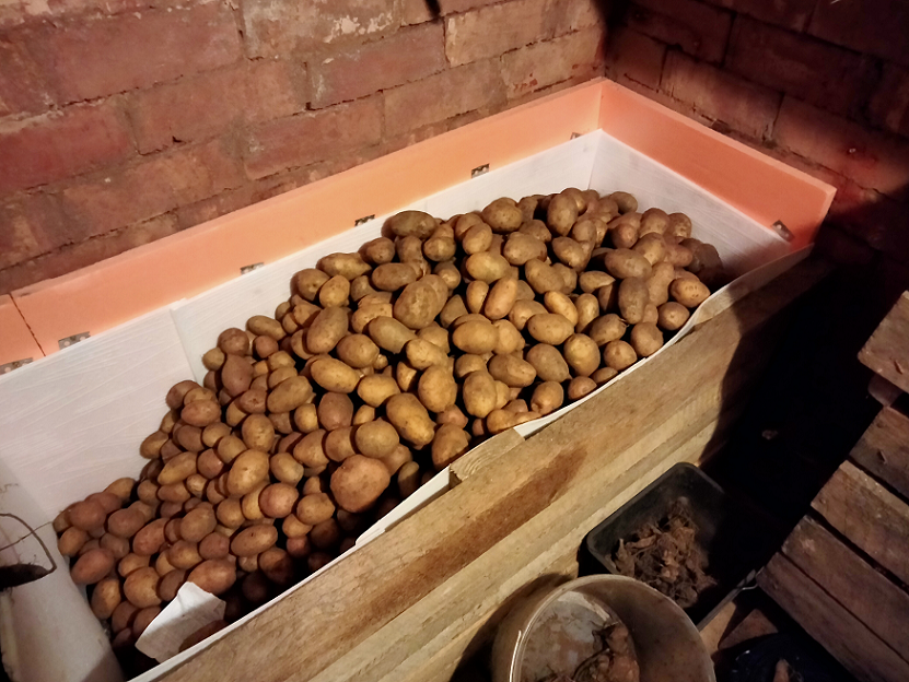 Загрузка урожая картофеля в подвал. Хранение в открытом бункере. Семенная в ящиках и мешках