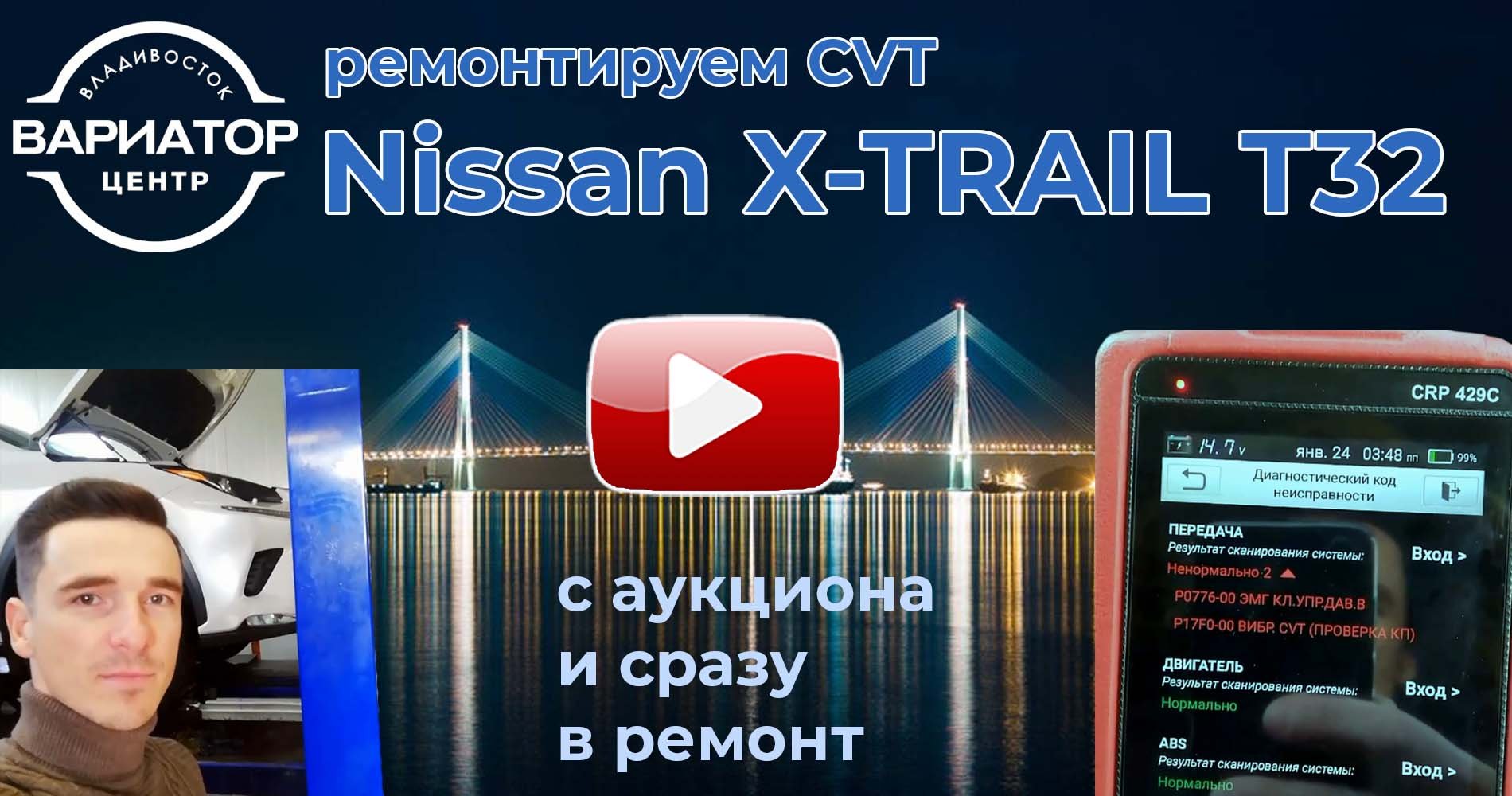 Только прибыл из Японии и сразу на ремонт вариатора, очень вероятно что пробег скручен, хотя клиент очень тщательно проверял историю по аукционам и площадкам. Случай не единичный. Популярные марки Ниссанов, едва растаможенные, весьма часто попадают на ремонт варика. Тойота - не исключение, но всё же реже. По симптомам: Длительная загрузка, более секунды (реально до 4 секунд), по сканеру две ошибки, по клапану и вибрация CVT P17F0 эта ошибка просто так не удаляется, только менять вариатор. наш телефон: +7 (904) 629-11-88 Сергей Бабинцев наш сайт: https://вариатор-центр-владивосток.рф/?utm_source=rutube наш VK: https://vk.com/cvt_25 наш Ютуб: https://www.youtube.com/channel/UCK2MArBpsou6mYDgvyNOm5g наш канал Дзен: https://zen.yandex.ru/id/6230d6a00efde23f3a16ce03 наш инстаграмм: https://www.instagram.com/variator_center_vladivostok/ наш телеграмм канал: https://t.me/variator_center_vladivostok