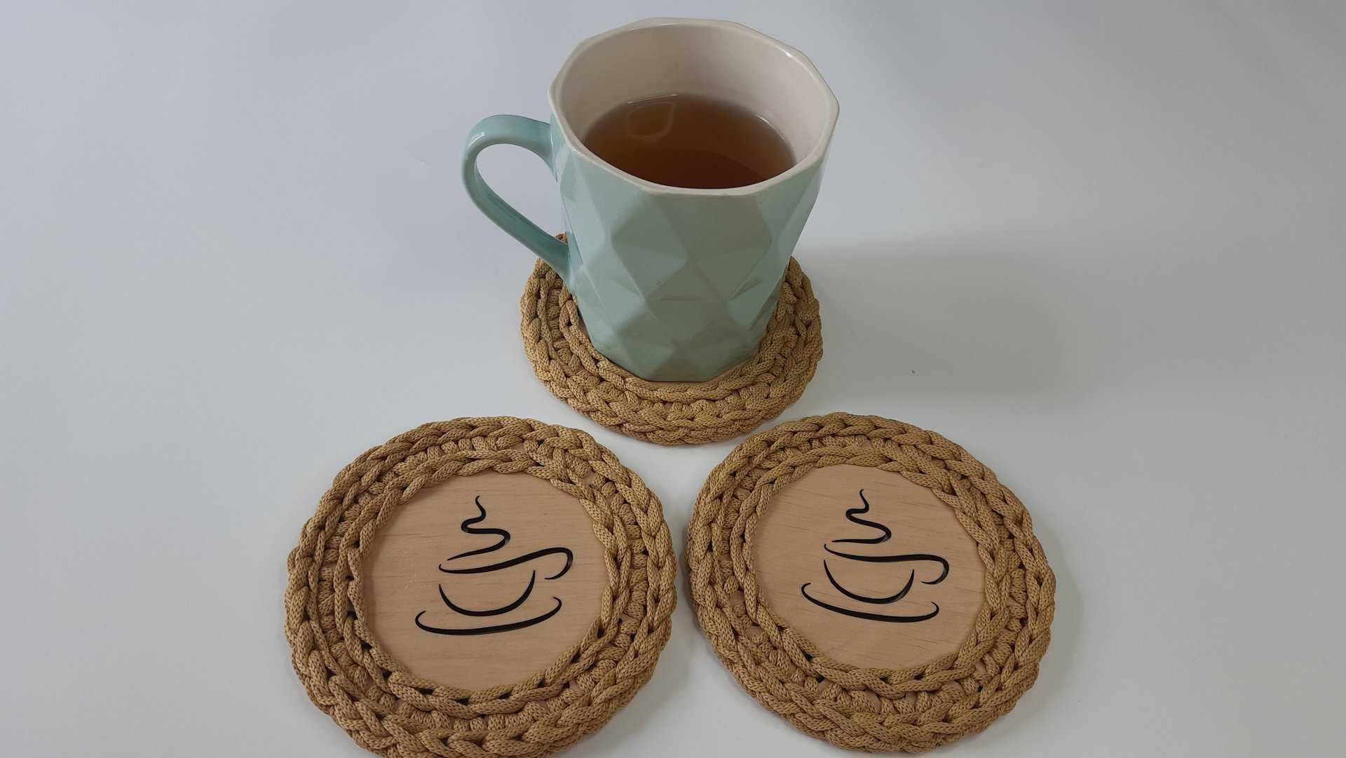 Подставка под кружку вязаная крючком из полиэфирного шнура на деревянном донышке. МК. Мастер класс