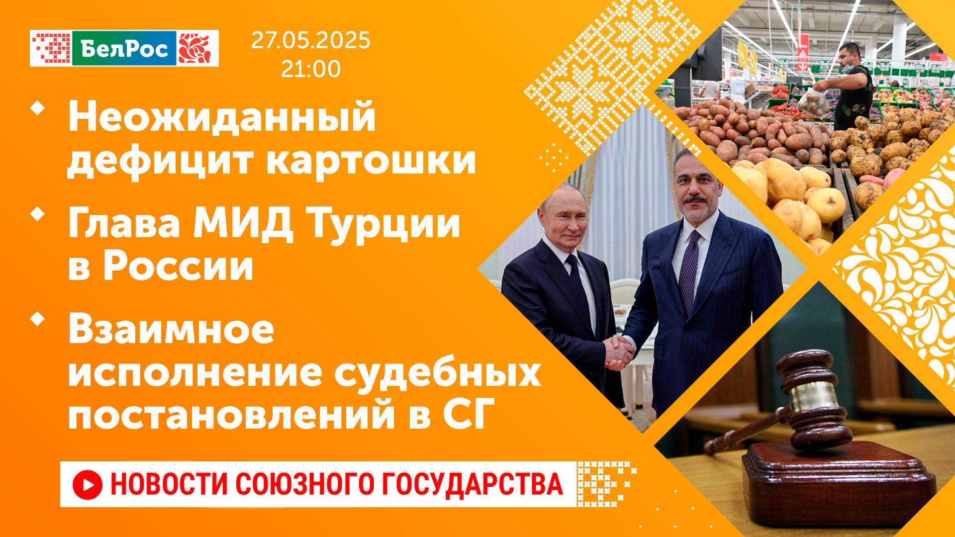 Закадровый текст озвучивает *ИИ Антон* Новости 27.05.2025 на 21:00 - Владимир Путин и Александр Лукашенко высказались о ситуации с картофелем в магазинах. - Лавров: Турция может принять второй раунд переговоров между Россией и Украиной. - В ходе двухдневного визита Хакан Фидан встретился с Владимиром Путиным. - Беларусь ратифицировала соглашение с РФ о взаимном признании судебных постановлений. - В Беларуси изменились критерии оценки качества предоставляемых транспортных услуг. Смотрите главные новости Союзного государства на телеканале БелРос. Ссылки на наши соц. сети Сайт: http://belros.tv/ Telegram: https://t.me/belrostv Одноклассники: https://ok.ru/group/55657426976918 ВКонтакте: https://vk.com/belrostv TikTok: https://www.tiktok.com/@belros_tv?_t=... RuTube: https://rutube.ru/channel/23501830/ Яндекс. Дзен: https://zen.yandex.ru/belrostvv Наши подкасты на Яндекс. Музыке: https://music.yandex.ru/album/25615251 #главныеновости #новостисегодня #СоюзноеГосударство