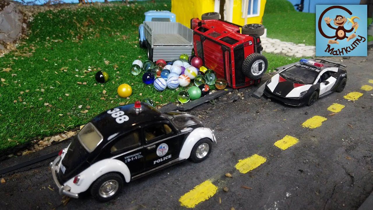 Красный джип гонял по дорогам не соблюдая правила. Когда загорелся красный фонарь светофора, старая машина решила выехать на дорогу, но джип пронося на красный свет. Джип резко затормозил и перевернулся на бок. Красная машина врезалась в грузовичок который перевозил шарики. Шарики рассыпались по газону. Теперь Полицейским машинкам и погрузчику придётся со всем разобраться. История про машинки игрушки для детей.