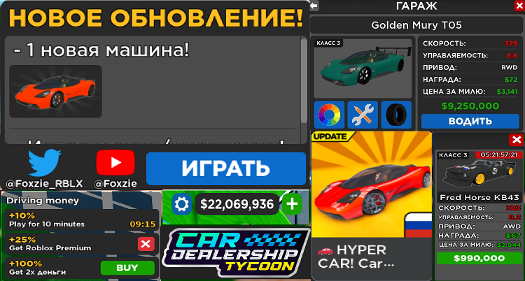 Мой Telegram канал: https://t.me/YouTubezang_nik555 В этом видео я: Купил все автомобили из нового обновления! Bought all the cars the new update! Car Dealership Tycoon in Roblox. Магнат автосалона в Роблоксе. Рабочие коды на момент выхода данного ролика: Промокоды: Season3Soon - 60K$ IWant50K - 50K$ Тайм коды: 0:00-Golden Mury T05 (9,250,000$) 0:20-Драг 0:40-Автострада 1:35-Трек 2:14-Ралли 3:07-Пустыня 3:36-Город 4:15- благодарность Локси 4:20-Дрифт по асфальту 5:00-дрифт на льду 5:58-Дрифт Локси 6:16-Промокоды 6:29-Fred Horse KB43 (990,000$) 6:34-Дрифт на льду 7:34-Драг 7:53-Улица 8:59-Пустыня 9:33-Автострада 11:33-Ралли 12:39-Трек 13:37-бюрнаут + дрифт Cпасибо за просмотр!