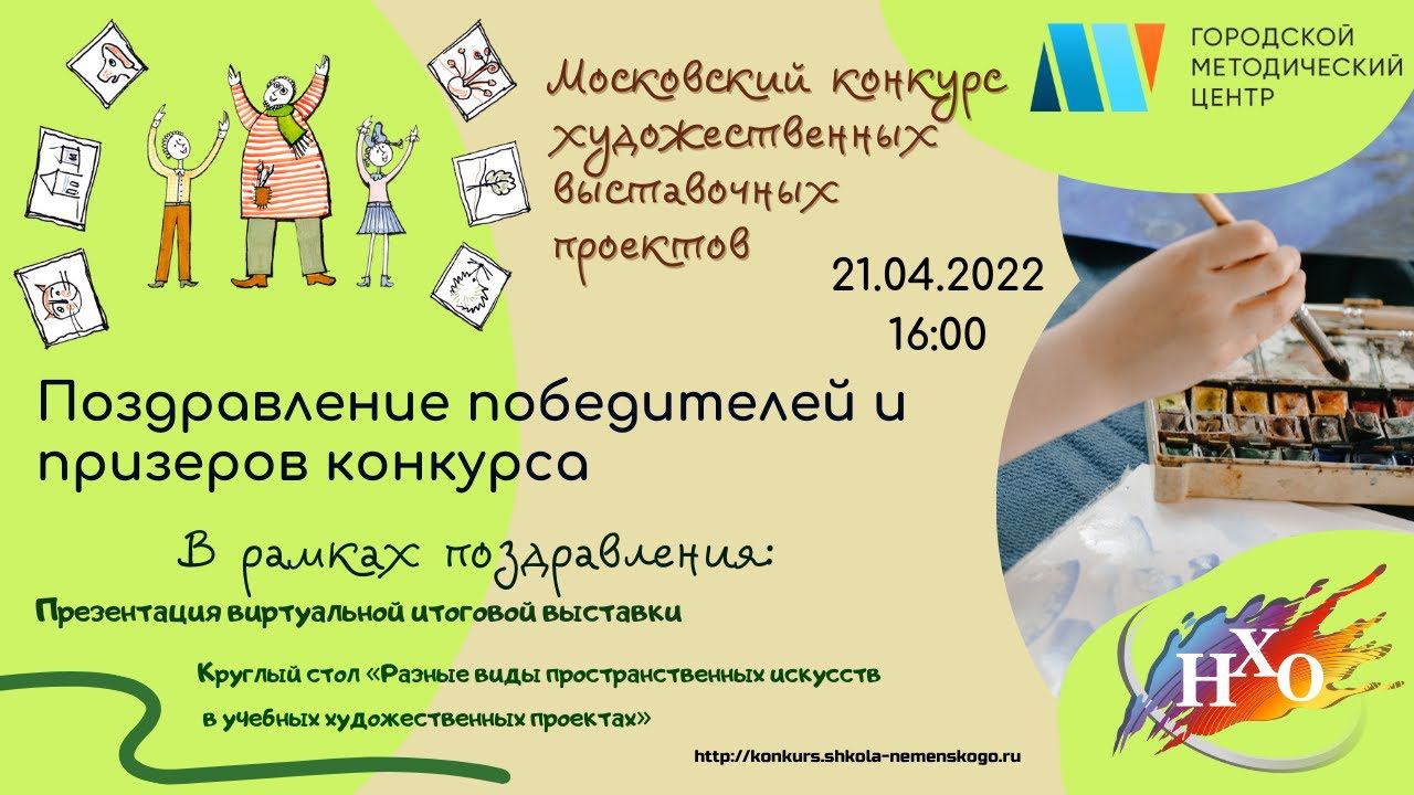 Поздравление победителей и призеров, презентация итоговой выставки Московского конкурса художественных выставочных проектов В рамках праздника награждения состоится: - объявление итогов конкурса и поздравление победителей и призеров; - презентация Итоговой виртуальной выставки; - круглый стол «Разные виды пространственных искусств в учебных художественных проектах» Посмотреть отобранные художественные проекты можно в виртуальном художественно-методическом ресурсе «Музей Школы Б.М. Неменского» (Коллекция пополняется) http://konkurs.shkola-nemenskogo.ru/frontend/vp/