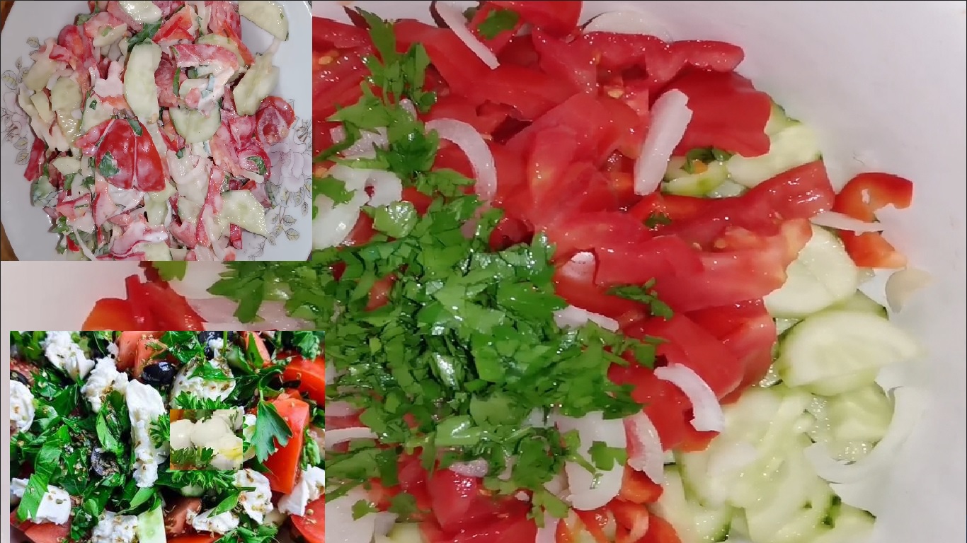 Салат из огурцов, помидор, болгарского перца с добавлением лука и зелени. Готовим быстро.