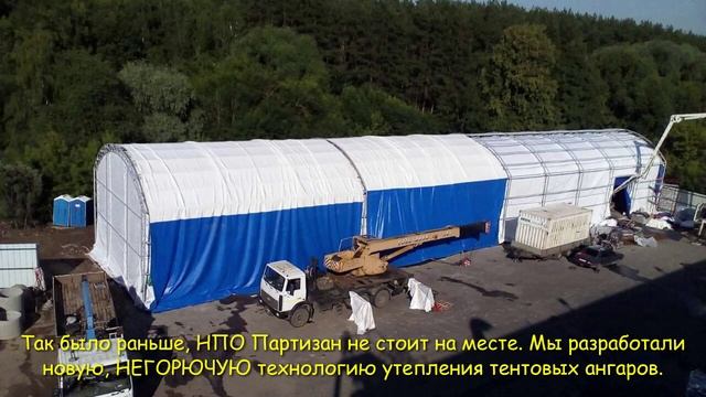 Мы разработали и внедрили в наши конструкции, абсолютно новое решение по строительству тёплых ангаров. НПО Партизан - https://utepla.com/uteplenie-angara/ +7 (985) 920-85-20 Москва +7 (977) 816-00-36 +7 (978) 789-85-86 Симферополь utepla@mail.ru СП 16.13330.2011 Стальные конструкции. Актуализированная редакция СНиП II-23-81* (с Изменением N 1) гласит, что «Конструкция силового каркаса постоянно доступны для наблюдения, оценки технического состояния, выполнения профилактических и ремонтных работ, установки оборудования без нарушения целостности утеплённого покрытия». В связи с этим мы не делаем нижний тент в сооружении ниже металлического каркаса кровли, каркас у нас открыт, как и предписывает нам СП. Да и в конденсате негорючий слой утепления, даже с учётом пароизоляции долго не живёт. Мы пошли другим путём, на верхний тент мы закрепляем наши Термоматы НГ (Не горючие) во весь пролёт, плотно скрепляем их между собой и накрываем вторым слоем тентового полотна. Секции тканевого материала выполняются цельными, что позволяет избежать протечек и сквозняков. Установка герметично-цельного мембранного покрытия (так называемого пирога) на верхний пояс арок по нашей технологии, позволяет избежать образования конденсата на стенах и кровле конструкции, и тем самым исключить эффект парной внутри помещения. Комфортный микроклимат не хуже, чем в капитальном сооружении с теплопотерями класса А. Ввиду отсутствия воздушной прослойки между утеплителем и тентом по технологии «Гибкий сэндвич», внутри изделия не образуется конденсат, а в самом помещении сухо и тепло как в капитальном здании.