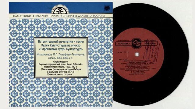 Вступительный речитатив и песня Кулун Куллустуура из олонхо «Строптивый Кулун Куллустуур». Исполнитель И.Г. Тимофеев-Теплоухов. Запись 1950-1960-х гг. Опубликовано: Якутский героический эпос: Кыыс Дэбилийэ. Новосибирск: Наука, 1993. 330 с. (Памятники фольклора народов Сибири и Дальнего Востока; [Т. 4.]). Грампластинка, сторона 1.