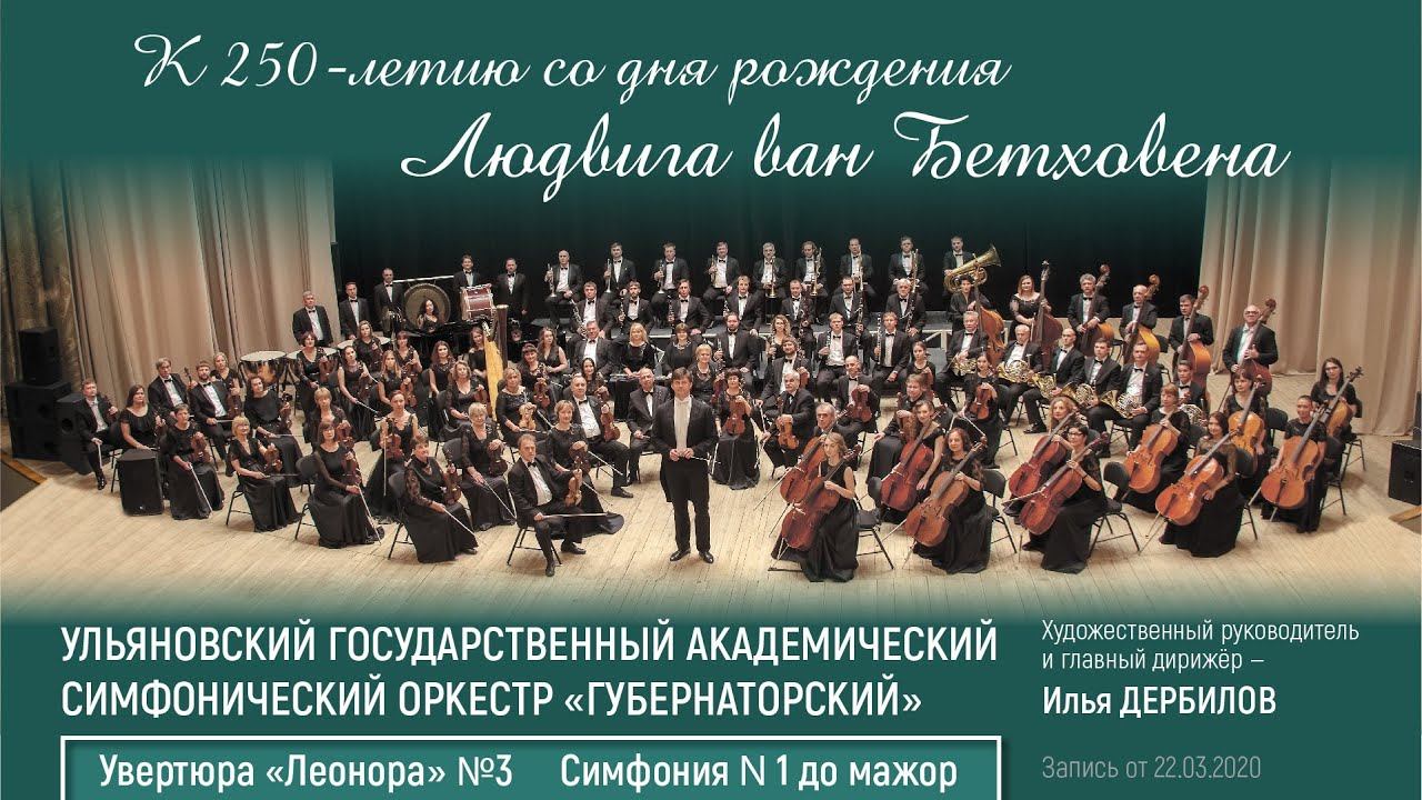 Увертюра «Леонора» №3, Симфония № 1 Трансляция концертной программы Ульяновского государственного академического симфонического оркестра «Губернаторский», посвящённой 250-летию со дня рождения Бетховена. Прозвучат увертюра «Леонора» №3 и Симфония № 1 до мажор (запись 22.03.2020г.). За дирижёрским пультом – художественный руководитель и главный дирижёр Илья Дербилов.