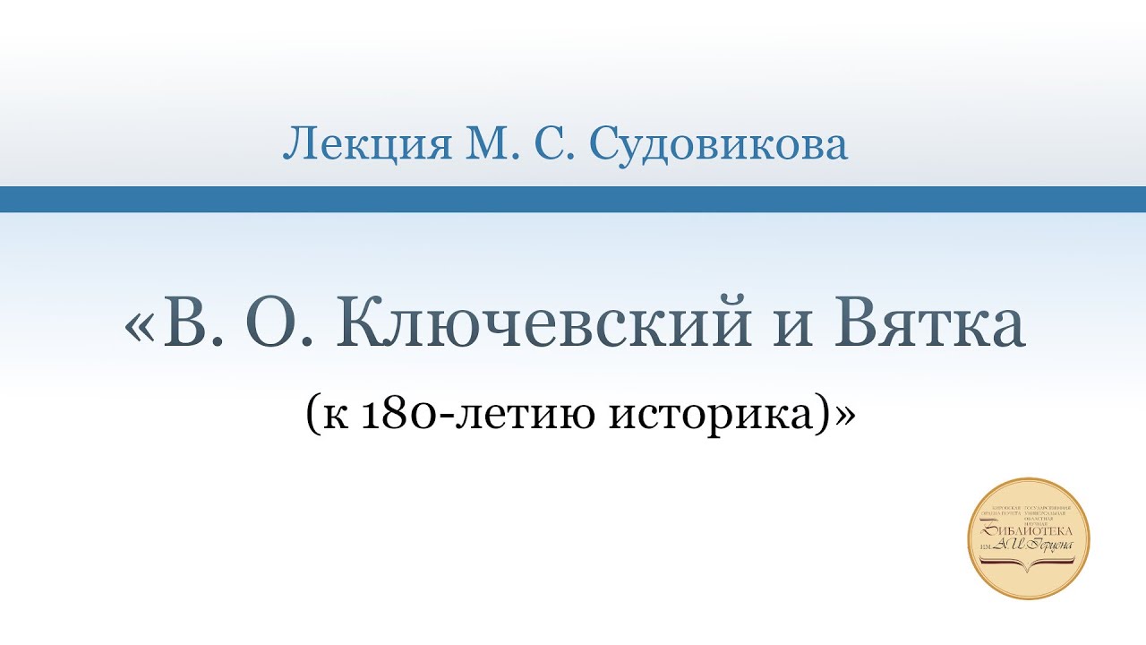 В лекции руководителя научно-исследовательского Центра регионоведения Кировской областной научной библиотеки им. А. И. Герцена, доктора исторических наук, профессора Михаила Сергеевича Судовикова «В.О. Ключевский и Вятка (к 180-летию историка)» рассказывается о жизненном пути и научных трудах выдающегося российского историка, заслуженного профессора Московского университета Василия Осиповича Ключевского (1841–1911). Особое внимание обращается на региональные аспекты истории в исследованиях учёного и на его прижизненные книжные издания из фондов библиотеки. (материал от 28 янв. 2021 г.)
