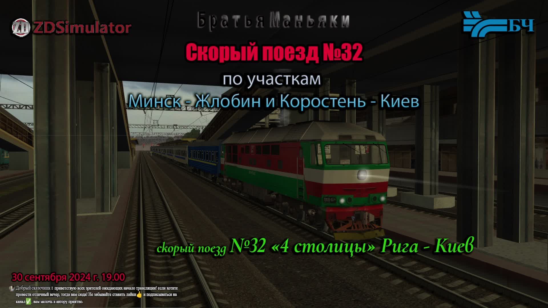 ZDSimulator - скорый поезд №32 "4 столицы", сообщением Рига - Киев - по участкам Минск - Жлобин и Коростень - Киев ========================================================================== Ссылка на донат-поддержку братьев: https://www.donationalerts.ru/r/zloykhrush ========================================================================== Мемасики на стрим: https://memealerts.com/64f424fbc986758d520b4ef6 ========================================================================== Официальный сайт : https://zdsimulator.com/ форум ZDSimulator: https://forum.zdsimulator.com/ Официальный канал Братья Маньяки в Телеграмм: https://t.me/manjac_broths зеркало на ютьюбе: https://youtube.com/live/WJsdkcLpTmQ