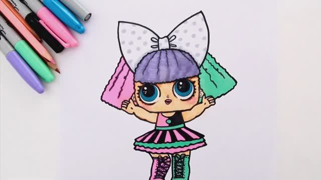 Как нарисовать и раскрасить Пранксту, куклу ЛОЛ Сюрприз (Серия 2) от Театрального клуба. У нее бирюзовые глаза и фиолетовые, розовые и бирюзовые волосы. На голове бантик в светло-серый горошек, платье-балерина двух цветов (розового и черного). Ее юбка состоит из трех слоев с рюшами. Она носит сапоги до бедра, один розовый, а другой бирюзовый. Ее старшую сестру зовут Лекси Гёрл, а домашнюю собаку — Пупста.