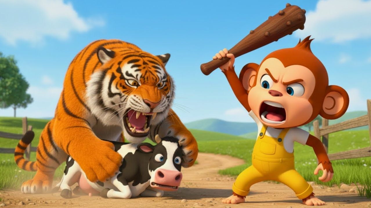 Тигр перекрыл дорогу, храбрая обезьяна-фермер придумала отличный план, чтобы защитить корову.