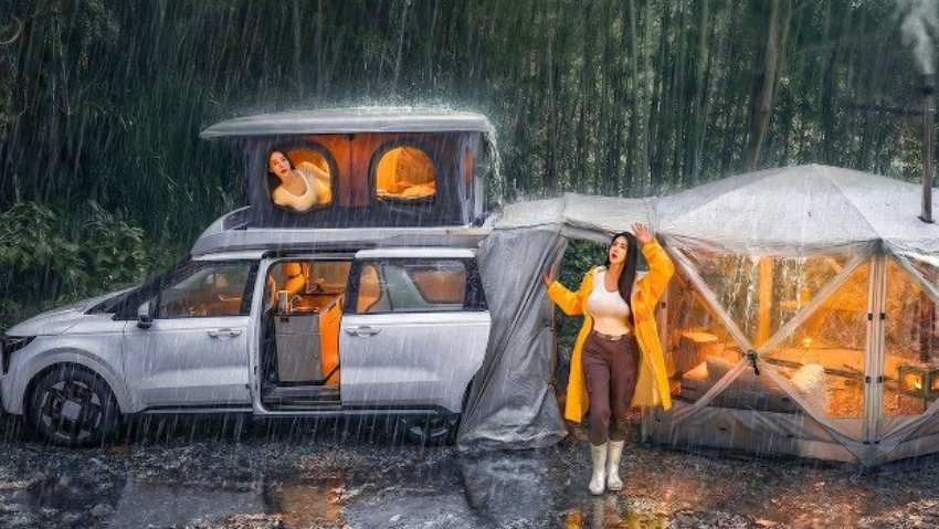 Кемпинг в сильный дождь в глубоком лесу.