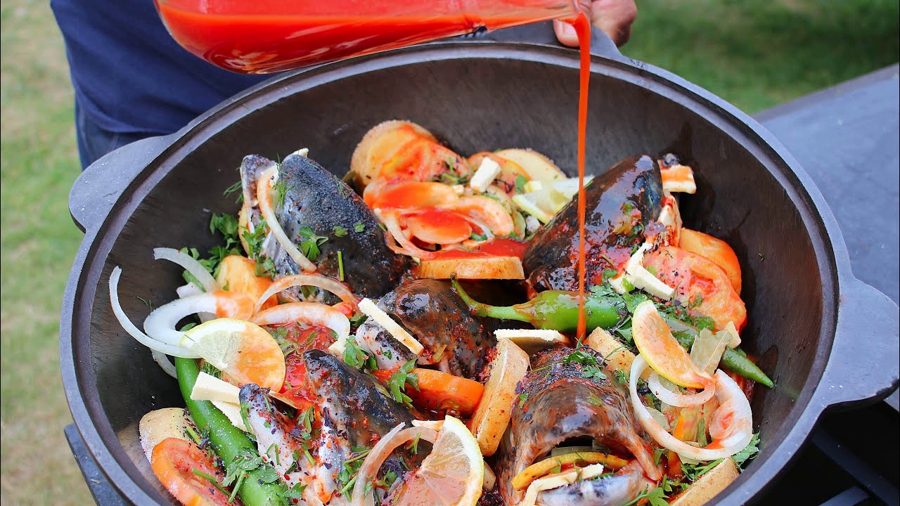 Очень вкусное блюдо из голов сёмги и овощей, приготовленное в казане на костре. Рецепт от Жоржа!