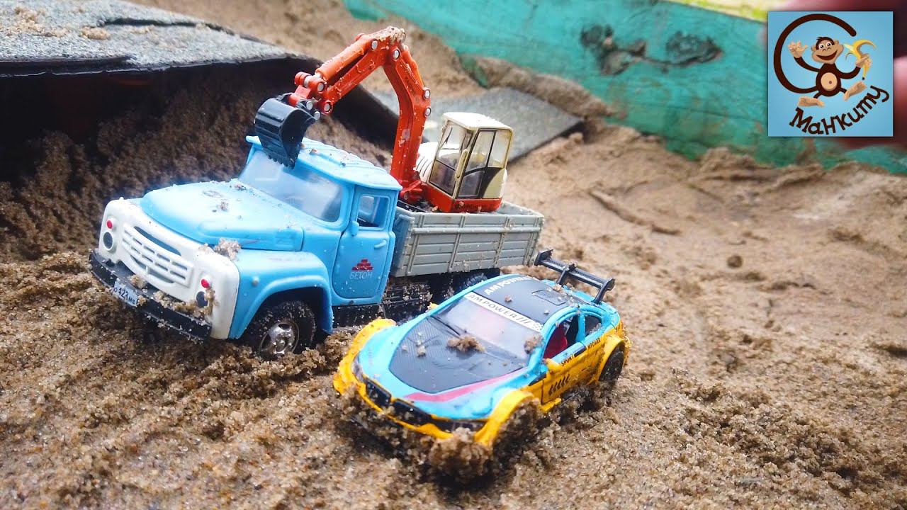 Дети и Машинки. Игры в песке - строим мост. Самосвал, экскаватор и машинки. Манкиту