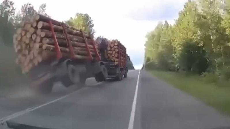 Под Нижним Тагилом лесовоз пошел на обгон на трассе и устроил лавину из бревен