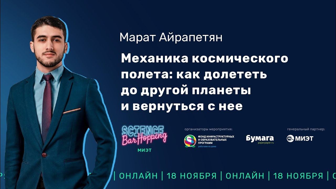 Спикер – Марат Айпетян Международная космическая станция работает уже около 30 лет. Для того, чтобы космонавты могли долететь до нее, требуется около 300 тонн топлива, а время полета по недавно разработанной схеме составляет 3–4 часа. Для полета на Марс топлива потребуется в разы больше, да и полет займет больше времени — от 6 месяцев. Как же долететь до другой планеты и вернуться обратно, какие физические законы лежат в основе космического полета и как рассчитывают траектории полета космических аппаратов? Об этом поговорили на Science Bar Hoping МИЭТ 18 ноября с инженером Маратом Айрапетяном.
