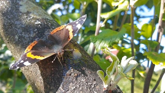 Бабочка-адмирал пьет яблочный сок.