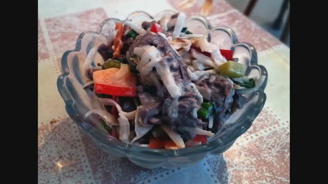 Сказать что это вкусный салат, значит не сказать ничего. Это невероятно вкусное сочетание говядины и редьки дайкон, жареный лук играет не последнюю роль. От себя я добавил огурчики и перец - плюсанул))